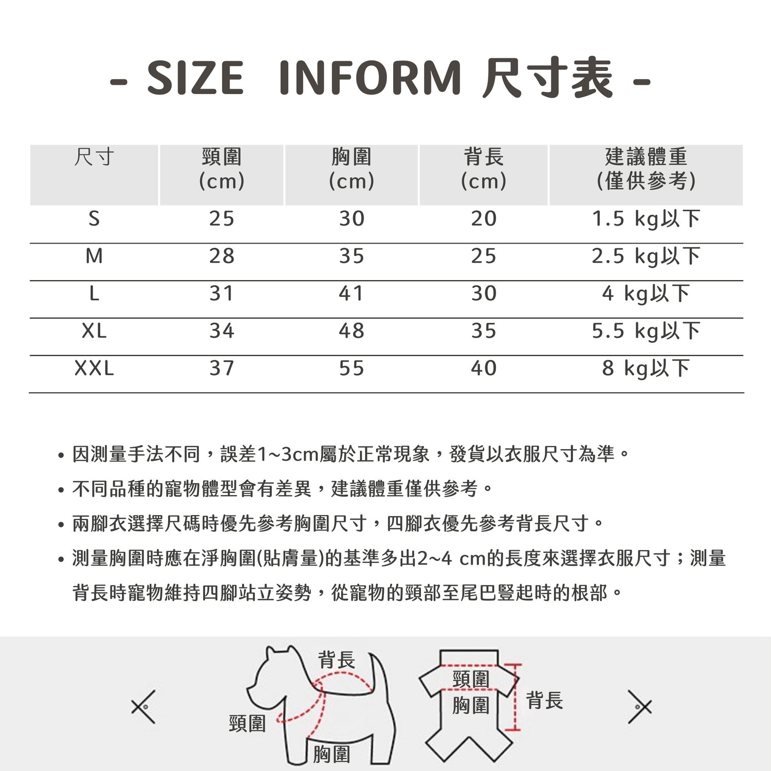 - 保持清潔: 商品無沾染任何寵物毛髮、皮屑或異味(建議試穿時在毛孩身上墊一層薄衣)。