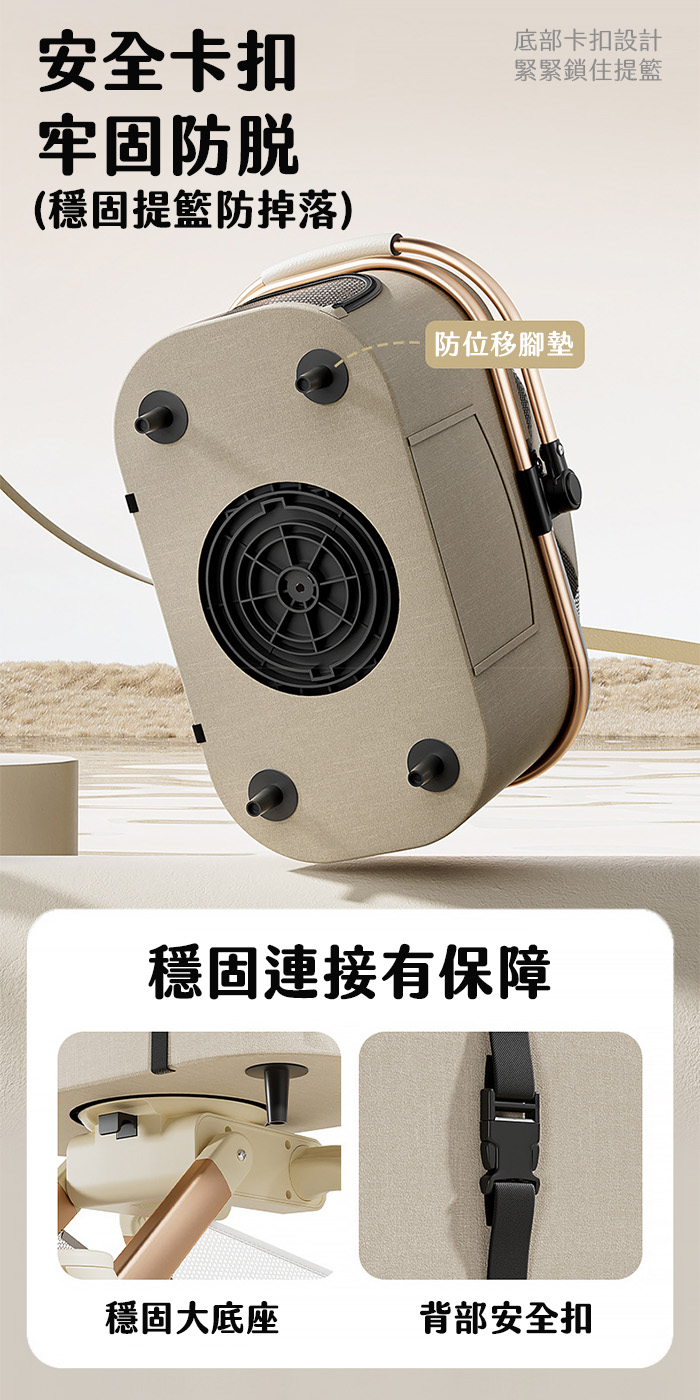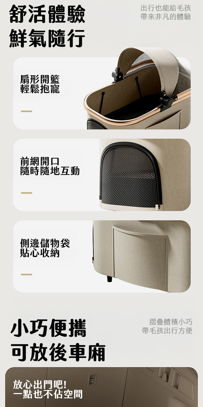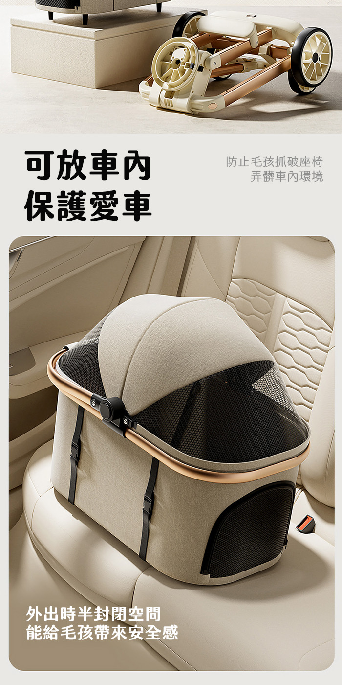 - 車載模式: 提籃可直接放置於汽車後座,作為寵物提籃,半封閉空間能給寵物帶來安全感。