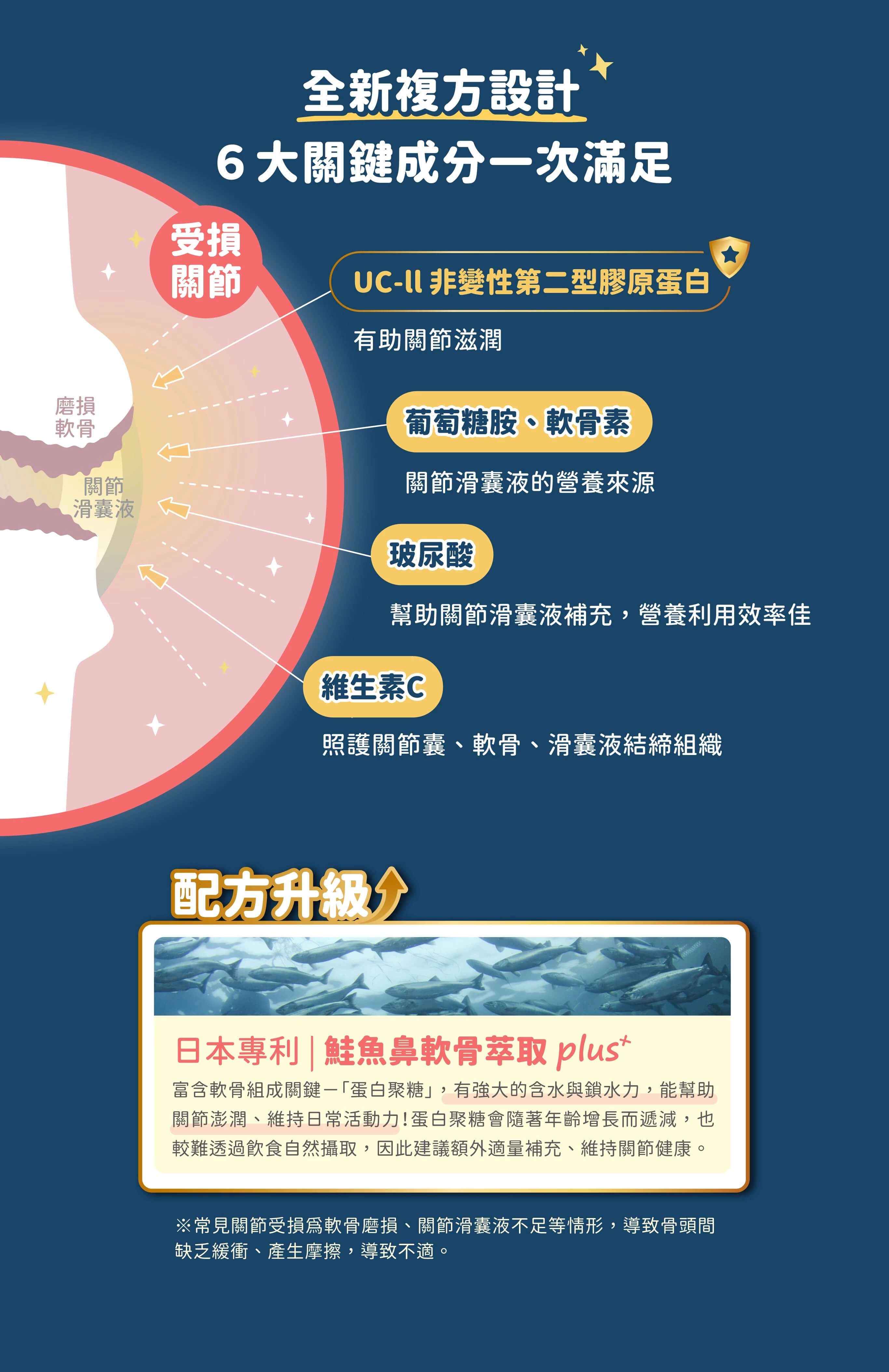 • 新升級!添加專利鮭魚鼻軟骨萃取+,幫助關節澎潤、維持活動力